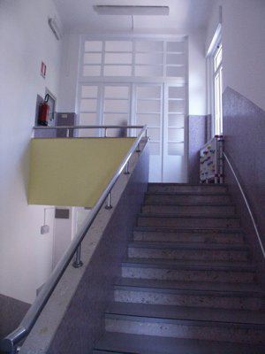 Lo schema compositivo di facciata presenta una fascia basamentale in pietra artificiale di protezione della muratura perimetrale dagli agenti atmosferici; il suo limite superiore segna il livello del piano terra rialzato, raggiungibile a mezzo di una breve scalinata esterna in pietra; sul rivestimento basamentale si aprono le finestre del piano seminterrato, in alluminio laccato bianco a tre ante, con inferriata metallica di protezione. Le restanti porzioni di facciata risultano semplicemente intonacate in color ocra. I serramenti di finestra al piano terra, a tre ante con sopraluce in alluminio laccato bianco, con avvolgibile esterno, sono riquadrati da sottili cornici in pietra naturale. Il portale vetrato di accesso è realizzato in legno massello verniciato naturale a due ante con sopraluce; semplici inferriate in ferro battuto proteggono le specchiature vetrate. Una spessa cornice in pietra bianca modanata segna l'ingresso principale. A livello del primo piano un profondo terrazzo si estende per tutta la lunghezza della facciata principale, con porte-finestra protette da avvolgibili esterni e da tende parasole ripiegabili. Un parapetto metallico verniciato a bacchette verticali corre lungo l'intero perimetro della terrazza. In corrispondenza degli estremi dell'edificio, la facciata arretra per lasciare maggior spazio alla terrazza. Il coronamento dell'edificio è completato da uno sporto di linda, rifinito da una scossalina metallica verniciata in colore grigio. Sul fronte nord i fori finestra si riducono di dimensioni e presentano alternativamente serramenti a doppia anta e serramenti ad anta singola con sopraluce, sempre protetti da avvolgibili esterni e incorniciati da sottili lastre in pietra. Internamente i pavimenti degli spazi comuni sono rifiniti in battuto di graniglia e cemento colorato. I serramenti di separazione dei corridoi e delle aule, di ampie dimensioni, coprenti l'intera altezza libera di interpiano, sono del tipo vetrato in legno verniciato in colore bianco. Le superfici murarie presentano un abbassamento in mosaico color ocra, mentre le parti restanti sono semplicemente intonacate in colore bianco. Il vano scala, del tipo appoggiato a due rampe, è rifinito con pedate in pietra di aurisina; il parapetto pieno rivestito in marmo di Aurisina è completato da un corrimano in acciaio inox posto a correre. Il pavimento delle aule è in pvc, mentre la pavimentazione della terrazza è composta da quadroni in agglomerato cementizio. Al piano interrato i pavimenti sono rifiniti in piastrelle di ceramica.
