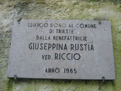 Targa esterna in pietra recante l'iscrizione:"edificio dono al Comune di Trieste dalla benefattrice Giuseppina Rustia ved. Riccio anno 1985"
