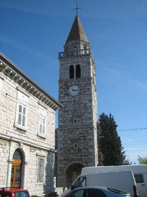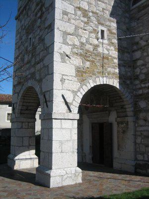 Complesso architettonico composto dalla chiesa storica dell'abitato di Prosecco. La chiesa è a pianta centrale con navata unica e presenta una facciata a capanna con campanile centrale sorretto da quattro archi a tutto sesto che ne costituiscono l'ingresso voltato. Struttura portante in pietra arenaria a vista nella facciata principale e intonacata nelle restanti facciate, abside segmentato e corpi accessori addossati lungo il fianco sinistro. Copertura a falde inclinate con manto in coppi curvi rossi, pluviali e gronde in lamiera con verniciatura. Aperture regolari e di piccole dimensioni con cornici in pietra bianca squadrata, due mezzelune sulla facciata principale e finestre ad arco allungate sul fianco destro. Il campanile presenta aperture a bifora con colonnina centrale e una balaustra in pietra. L'ingresso principale è costituito da un portale in pietra con mensola aggettante superiore e affresco decorativo nel sopraluce. Internamente la chiesa presenta soffitto, abside e pareti decorate ad affresco con motivi floreali e scene bibliche; l'altare è in marmo; il coro, in posizione rialzata sopra l'ingresso, è sorretto da due pilastri in marmo e presenta un parapetto ligneo con decorazioni pittoriche.