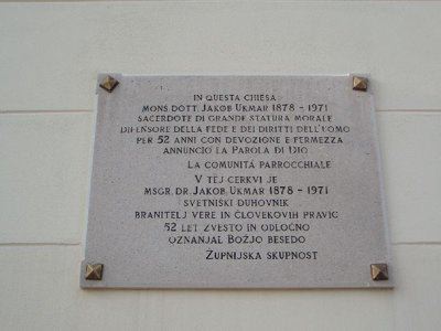 TARGA (esterno): Lastra lapidea collocata sul fronte principale, a fianco dell'ingresso, recante iscritta la dedica "IN QUESTA CHIESA/ MONS. DOTT. JAKOB UKMAR 1878 - 1971/ SACERDOTE DI GRANDE STATURA MORALE/ DIFENSORE DELLA FEDE E DEI DIRITTI DELL'UOMO/ PER 52 ANNI CON DEVOZIONE E FERMEZZA/ ANNUNCIO' LA PAROLA DI DIO/ LA COMUNITA' PARROCCHIALE". Segue la traduzione in lingua slovena. RIQUADRO (esterno): Lastra lapidea con cornice posta sopra il portone principale d'ingresso, con iscrizione latina.
