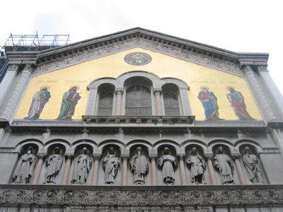 AFFRESCHI (interno): Affreschi raffiguranti "Cristo Pantocratore" con gli "Angeli reggicartigli" nella cupola centrale, nelle absidi laterali "San Spiridione al concilio di Nicea" e la "Vergine Assunta". Nella superficie superiore dell'ingresso la "Tomba di San Spiridione" e al di sopra delle porte laterali le immagini del "Profeta Elia" e il "San Giovanni Battista". I rimanenti mosaici della facciata principale rappresentano i "Quattro Evangelisti" e il "Padre Eterno". ICONOSTASI (interno): Iconostasi formata da dipinti raffiguranti la "Crocefissione" al centro ed ai lati la "Resurrezione" e il "Battesimo di Cristo". A completamento della struttura si trovano quattro icone che rappresentano "San Spiridione, la "Vergine col Bambino", "Cristo Re" e l'"Annunciazione". MOSAICI (esterno): Mosaici raffiguranti "San Spiridione" al di sopra dell'ingresso principale, "San Michele Arcangelo" e i "Santi Atanasio" e "Gregorio Nazianzeno" nelle lunette laterali. Sulla parete destra si trovano le raffigurazioni della "Madonna con Bambino" e i "Santi Basilio" e "Giovanni Crisostomo". I mosaici rimanenti rappresentano teorie di santi. SCULTURE (esterno): Statue di "Santi" a decorazione delle nicchie della facciata principale.