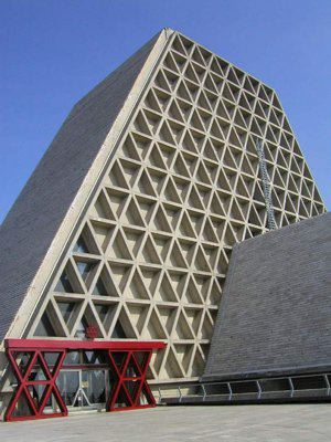 L' architettura del tempio sacro è basata su moduli triangolari rigorosamente calcolati che, ripetendosi nelle stesse proporzioni, compongono non solo la costruzione, ma anche ogni suo singolo arredo. La massa volumetrica è caratterizzata da equilibrio ed armonia e, nonostante la sua imponenza di 48.000 metri cubi, risulta leggera e ariosa, grazie al reticolato delle travi in cemento armato disposte a triangolo che le conferiscono l'aspetto di una trina trasparente. La struttura è costituita da due chiese sovrapposte, l'inferiore e la superiore, entrambe con pianta a croce greca. Le due aule di culto sono collegate tra loro da una scala interna, ma hanno anche ingressi indipendenti. La cella campanaria è costituita da un prisma capovolto che s'incunea nella copertura della campata.