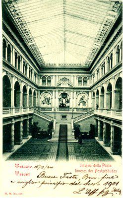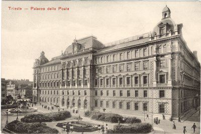 L'imponente palazzo venne costruito tra il 1890 e il 1894 su progetto dell'architetto viennese Friedrich Setz, sull'area in precedenza occupata dall'edificio della Dogana. Costruito dall'impresa Gregersen e Schwarz sotto la direzione dell'ingegnere Guido Levi, l'immobile costituisce un significativo esempio di architettura eclettica nell'ambito della tipologia comune agli edifici pubblici austriaci dell'epoca. Il palazzo venne concepito fin dall'inizio per ospitare sia gli uffici postali e telegrafici sia quelli della finanza, per cui all'interno è strutturato in due corpi distinti, con ingressi separati rispettivamente in piazza Vittorio Veneto e Largo Panfili. Sui prospetti laterali si aprono i portoni per il transito dei carri postali. All'ultimo piano della facciata principale sono collocate alcune statue. A coronamento della parte centrale della facciata vi è una copertura a cupola al centro della quale è collocato un abbaino delimitato da due erme e con un orologio. Cupole si ergono anche agli angoli della costruzione. All'interno si apre un atrio spazioso da cui parte, al centro, un grande scalone che da accesso al vestibolo superiore. Al primo e al secondo piano corridoi con arcate a crociera si affacciano sul vestibolo.