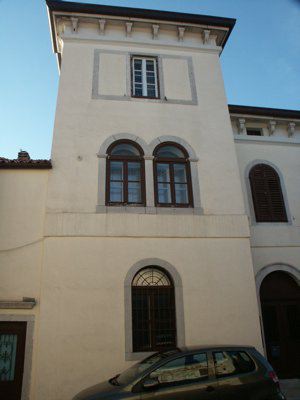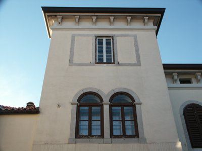 Le facciate sono trattate ad intonaco liscio color rosa sui quattro lati. Sul fronte principale un bassissimo battipiede in pietra calcarea protegge l'attacco a terra dell'edificio da danneggiamenti accidentali. Un alto marcapiano quadro di colore uguale a quello della facciata separa le finestre del piano terra da quelle del primo piano. Il coronamento è costituito da un marcapiano quadro in pietra e una serie di fitte mensole a voluta poste a sostegno della banchina e interrotte regolarmente da fori rettangolari di aerazione del sottotetto. Sul fronte principale, tutti i fori architettonici sono archivoltati, provvisti di cornice in pietra calcara, con serramenti vetrati lignei verniciati bianchi a doppia anta a quattro specchiature con sopraluce e serramenti oscuranti esterni verniciati color testa di moro. Spiccano sull'avancorpo a tre livelli una bifora al primo piano e un foro rettangolare al piano secondo, affiancato da altri due tamponati. Sul prospetto ovest i fori architettonici rettangolari con serramenti vetrati lignei doppi, a doppia anta a sei specchiature, sono protetti da oscuranti esterni verniciati color testa di moro. Grondo e pluviali sono in metallo verniciato color testa di moro e scendono esternamente lungo le facciate laterali. Il manto di copertura è in coppi curvi rossi "uso Trieste". Internamente rifinito ad intonaco con abbassamento a smalto, presenta pavimentazioni varie dal tavolato grezzo, alle marmette di cemento e graniglia, fino alla pavimentazione in pietra calcarea bocciardata.