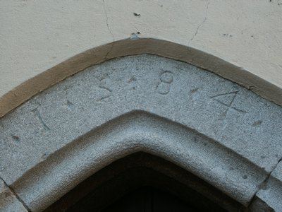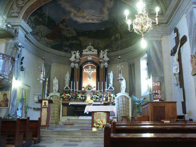 ISCRIZIONE (esterno) Sull'arco acuto dell'ingresso laterale è scolpita la data del 1584, presumibile data di edificazione della chiesa. ISCRIZIONE (esterno) Sull'architrave dell'ingresso principale si legge un'iscrizione dedicata al vescovo Rinaldo Scarlichio che consacrò nel 1628 l'edificio: "Antist(ite) et com(ite) Terg(estimo) Reinaldo Scarlichio an(n)o sal(utis) MDCXXVIII". EPIGRAFE (esterno) Su un concio a destra dell'ingresso principale si legge: "Anno D(omi)ni MDLXX/XIIII mensis Juni XIII / clavigari Marcus Boga/tac [...] Iacob Bosall [...]". AFFRESCO (interno) La volta sopra la navata, trattata a fresco da F. Ferlettig nel 1910, ospita la raffigurazione dell'Invenzione della Croce. STATUE (interno) L'altare maggiore è arricchito dalle statue marmoree raffiguranti S. Rocco, la Madonna, S. Giovanni Evangelista e S. Primo. AFFRESCO (interno) La volta dell'abside è decorata a fresco con la scena di Gesù nell'Orto. AFFRESCO (interno) Sulle pareti orientali delle cappelle laterali l'artista Antonio Jelo?in dipinse nel 1921 la scena della Liberazione di San Pietro e la raffigurazione della Sacra Famiglia. ELEMENTI ORNAMENTALI (interno) Sull'altare destro una pala decorata ad olio da una suora nel 1975 raffigura i Santi Pietro e Paolo, mentre sull'altare sinistro campeggia una statua lignea dedicata alla Madonna con Bambino. ELEMENTI ORNAMENTALI (interno) Alle pareti è raffigurata la Via Crucis in pannelli lignei a bassorilievo.