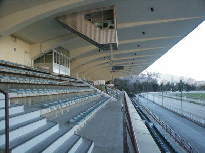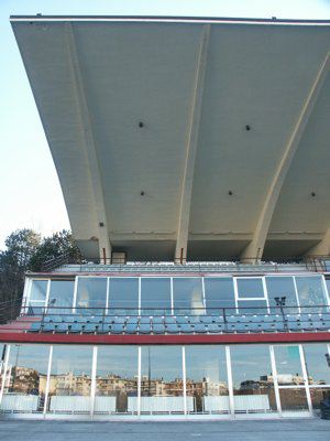 La struttura è completamente trattata in clacestruzzo armato facciavista, dipinto direttamente senza intonacatura. Le superfici vetrate completamente apribili sono in alluminio satinato. Le gradonate esterne ospitano i seggiolini conformati in plastica e le scale si distribuzione alla tribuna sono rivestite in gomma antiscivolo. I parapetti sono costituiti da semplici correnti tubolari sovrapposti verniciati in color marrone. Internamente le superfici sono per lo più spoglie e lasciano leggere pienamente la struttura, che è posta a fondamento del progetto architettonico. La pavimentazione è costituita da marmette colorate di graniglia e cemento al piano terra, da piastrelle in gres porcellanato al primo piano, mentre le scale di accesso ai piani superiori della tribuna sono rivestite in marmo travertino. L'estradosso di copertura è rivestito e impermeabilizzato completamente in guaina ardesiata; l'acqua piovana viene raccolta nella concavità della vela e convogliata a terra in pluviali posti internamente alla struttura in calcestruzzo armato.