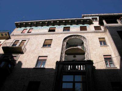 Realizzato su progetto dell'architetto Carlo Bonetti nel 1906 per ospitare numerosi appartamenti abitati dalle illustri famiglie cittadine di inizio secolo, si presenta originale in termini decorativi e di concezione plastica della struttura di chiara ascendenza Liberty, con motivi rintracciabli nella produzione della scuola viennese di Otto Wagner. Le facciate sono movimentate da parti in aggetto, nicchie, e da soluzioni plastiche quali balconi sagomati con ringhiere, serrande avvolgibili e saracinesche a rotolo. La volumetria dell'edificio è alleggerita dalle aperture balconate poste agli angoli. Di particolare rilievo è la decorazione delle facciate svolta attraverso elementi plastici e mosaici colorati con giochi di volute ed intrecci di nastri, fiori e rami. Di interesse inoltre la scala elicoidale interna; è ancora presente al piano attico una stufa in ceramica, ultima testimonianza dell'originale sistema di riscaldamento.
