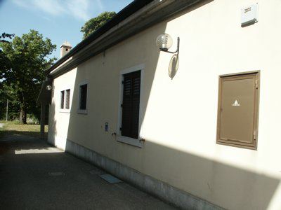Il fabbricato presenta un basamento in pietra artificiale posto a correre lungo tutto il perimetro; le restanti parti delle facciate sono intonacate lisce in color giallo chiaro. Fori architettonici rettangolari sono incorniciati da elementi in pietra bianca bocciardata. I serramenti vetrati sono realizzati in alluminio color testa di moro con oscurante esterno a doppia anta a lamelle orientabili. La linda in calcestruzzo armato faccia vista supporta gronde e pluviali in lamiera verniciata color testa di moro, che raccolgono le acque meteoriche dal manto in coppi curvi rossi "uso Trieste". Sul lato postico un porticato in struttura intelaiata in calcestruzzo armato e copertura a falda unica in coppi curvi rossi protegge l'ingresso agli spogliatoi posizionati al piano terra.