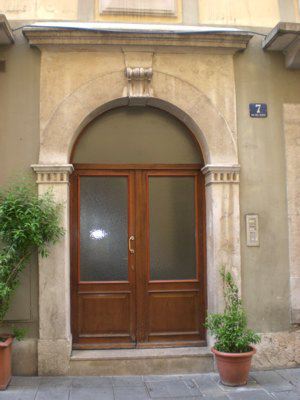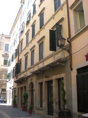 L'edificio sorge all'interno della zona più antica di Trieste, Cittavecchia, modificata negli anni Trenta del Novecento da pesanti interventi avviati con il progetto di sistemazione del colle di San Giusto. Tra gli immobili risparmiati dalle demolizioni rientra l'edificio con affaccio su Via del Ponte, occupato al piano terra da un locale commerciale e ai piani superiori da abitazioni. In linea con l'antica tipologia architettonica del borgo, la struttura presenta fori finestra e bassi portali ad arco arricchiti da cornici lineari in pietra bianca d'Aurisina e capitelli. Il portale centrale si caratterizza per la presenza di piedritti a piani lisci con dadi d'imposta sporgenti e capitelli modanati; ai lati si aprono tre fori arricchiti da cornici in pietra bianca. Al 1872 risale un primo progetto di modifica sull'immobile che prevedeva l'aggiunta di un quarto piano, come testimonia la presenza in facciata di una cornice marcapiano in pietra. Un successivo piano di recupero interessò, tra il 1984 ed il 1985, l'intero isolato, sottoposto al "Piano di Recupero" con L 457 del 1978; gli interventi realizzati sull'edificio a firma dell'architetto Franco Stagni, sono stati indirizzati, in particolare, al restauro degli elementi architettonici esterni e alla ricostruzione delle chiostrine interne preesistenti, mantenendo la scala a chiocciola nella posizione originaria.