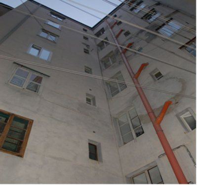 Contemporaneo ad altri sei complessi immobiliari del medesimo isolato, l'edificio viene costruito nella zona di recente urbanizzazione creata dallo sbancamento dei terreni ai piedi del colle di Scorcola; l'area, interessata dalla metà dell'Ottocento dai lavori per la realizzazione della nuova ferrovia cittadina, viene arricchendosi di numerosi edifici multipiano, caratterizzati da un'architettura modernista, essenziale nello sviluppo planimetrico e ricca nella decorazione delle superfici murarie. Il palazzo si affaccia su via Udine, già via Belvedere a ricordo della omonima proprietà distrutta per fare spazio ai nuovi edifici signorili a destinazione residenziale. Il progetto dell'edificio, approvato nel 1905, reca le firme dell'impresa costruttrice "Gobel & Forti", proprietaria del fondo e del "costruttore edile autorizzato" Ferdinando Walenta. In linea con la tipologia architettonica dei coevi palazzi del quartiere, la struttura presente cinque piani fuori terra più soffitta abitabile. La superficie muraria, con basamento rivestito a bugnato liscio, è arricchita da elementi decorativi a rilievo di chiara ascendenza Liberty; motivi floreali e nastri sono collocati in corrispondenza delle specchiature e delle cornici dei fori finestra. L'immobile ha ospitato fino a pochi anni fa la caserma della Guardia di Finanza.