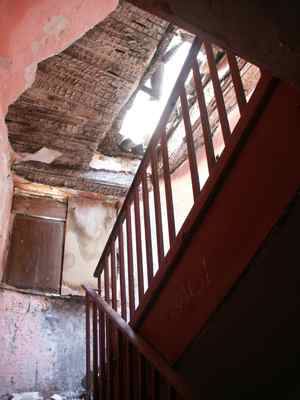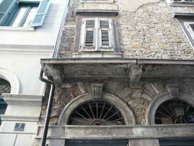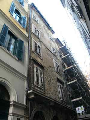 FACCIATA SU VIA BECCHERIE Basamento in pietra bianca bocciardata, rivestimento della fascia al piano terra in pietra bianca bulinata in corrispondenza del locale commerciale. Fori al piano terra con cornici arcuate in pietra bianca bulinata, decorate da chiavi di volta con volute in pietra. Architrave orizzontale sviluppato su tutta la lunghezza di facciata. Al centro un'iscrizione parzialmente leggibile (forse "MACELLERIA"). Sopraluce protetti da inferriate in ferro battuto. In corrispondenza del sopraluce del foro centrale, una lanternina in ferro battuto ed un'iscrizione recante la data 1851 (Pict0001.jpg). Banchina su mensole squadrate in pietra bianca a livello del primo orizzontamento, a protezione dell'ingresso al locale commerciale. Superficie di facciata trattata ad intonaco con marcapiano intonacato in corrispondenza del solaio del terzo piano. Serramenti oscuranti esterni in legno uso Trieste, montati su cornici in pietra bianca bulinata, con architrave a mensola al primo piano, architrave semplice ai piani superiori. Gronda e pluviale in lamiera. FACCIATA SU ANDRONA DEL PANE: Facciata trattata ad intonaco su tutta l'altezza. Fori architettonici con cornici semplici in pietra bianca bulinata. Porta di ingresso al piano terra in legno massello verniciato. Serramenti esterni dei piani superiori in legno senza oscuranti, ad otto specchiature con apertura a ghigliottina. INTERNO Scala con pianerottoli e gradini in lastre di pietra bianca bulinata e corrimano in ferro. Serramenti interni lignei e pavimenti in doghe di legno.
