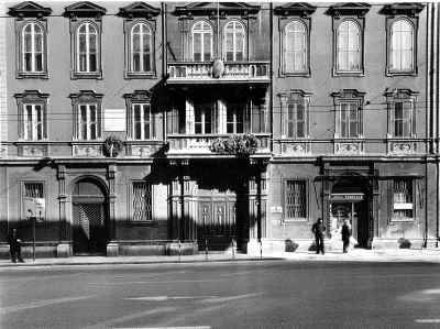 Serramenti esterni tutti in legno, di diverse tipologie: al piano terra doppie finestre rettangolari a quattro specchiature con cornice in pietra bianca bulinata ed inferriata in ferro battuto; al primo piano doppie finestre rettangolari a quattro specchiature, con edicola in pietra bianca a decorazione del foro architettonico e motivo geometrico a rilievo nella specchiatura sotto il davanzale in pietra; al secondo piano doppie finestre arcuate a sei specchiature, decorate da cornice a rilievo in pietra bianca e timpano triangolare nella parte superiore; al terzo piano finestre metalliche singole ellittiche con cornice in pietra bianca sul fronte principale (PICT0027.JPG), doppie rettangolari in legno con apertura ad anta sui fronti secondari. Finestre tutte rettangolari in legno con cornice semplice in pietra sui fronti affacciati sul cortile interno. Al piano terra finestre rettangolari con serramenti oscuranti in legno a doghe incrociate in corrispondenza del Bar Tartini sulla via Martiri della Libertà. Portali al piano terra in legno massello intarsiato, incorniciati da edicole in pietra bianca di diversa fattura. Fori commerciali con ampie vetrate con telaio e cassonetto in ferro verniciato. Serramenti interni in acciaio verniciato nelle aule e nelle parti comuni; in legno massello intarsiato, con cornici in marmo scuro o legno in corrispondenza dei locali di rappresentanza. Edicola decorativa sulla facciata principale sviluppata a tutta altezza in corrispondenza dell'ingresso (PICT0039.JPG). Paraste in pietra binate con motivi geometrici a forma piramidale a lato del portale ligneo a sostegno di quattro mensoloni a voluta, posti a loro volta a sostegno del balcone con parapetto in pietra bianca e balaustrini a sezione circolare. Balcone al secondo piano con due finestre arcuate binate, decorate da edicola con timpano triangolare. Marcapiano a livello del solaio del quarto piano con semplici modanature a dentello rompigoccia; sporto di linda con banchina in pietra bianca sostenuto da mensole a voluta e decorato da una doppia modanatura ad ovuli sovrastata da dentelli rompigoccia. Pluviali in acciaio zincato esterni in facciata lato strada solo tra il solaio del primo e del terzo piano, sotto forma di colonnine posizionate secondo i ritmi di facciata. Sulle altre facciate, pluviali e gronde in ferro verniciato. Atrio d'ingresso con pavimento in marmo di Aurisina, delimitato da colonne marmoree con capitello corinzio, sovrastato da soffitto decorato da motivi geometrici a stucco. Vano scala principale di carattere monumentale (PICT0056.JPG), sovrastato da volta a padiglione decorata con motivi a stucco con lucernario vetrato a specchiature rettangolari e lampadario a candelabro in ferro battuto; gradini in pietra bianca bulinata sostenuto da colonnine in marmo rosso con capitello corinzio e parapetto in pietra bianca con corrimano in ottone lucido recentemente applicato; pareti decorate con specchiature in spatolato alla veneziana e cornici in stucco. Pavimento intarsiato a motivi geometrici in marmo bianco, rosso e nero in corrispondenza dei pianerottoli. Anfore in pietra bianca ad uso fioriera a decorazione del parapetto dell'ultimo livello della scala. Vano scala secondario di tipo appoggiato con gradini in pietra bianca bulinata, pianerottoli in pietra d'Aurisina tipo "fiorita", parapetto in ferro verniciato con motivi a voluta e corrimano in legno. Scala di accesso al terzo piano di tipo appoggiato in calcestruzzo armato, con gradini rivestiti in pietra d'Aurisina tipo "fiorita", parapetto in ferro verniciato a bacchette verticali e corrimano in legno. Scala esterna di accesso all'appartamento del custode, di tipo a mensola, con gradini in pietra bianca, parapetto in ferro verniciato decorato a volute. Baldacchino in ferro verniciato a protezione della porta d'ingresso all'alloggio con copertura a due falde inclinate e gronda di raccolta acque meteoriche (PICT0031.JPG). Aula magna in stile barocco con volta a padiglione decorata da motivi a stucco e pietra bianca, ampie superfici specchiate, pavimento in legno intarsiato a motivi geometrici, lampadari e candelabri a parete con pendagli in cristallo e tendaggi in velluto pesante di colore scuro. Ampliamento con struttura in telaio di acciaio zincato e serramenti in alluminio verniciato colore marrone, vetrati a tutta altezza, suddivisi in specchiature rettangolari, formante nell'area centrale un patio rettangolare trattato a giardino. Nelle parti rinnovate, pavimenti in quadroni di linoleum, controsoffitti in listoni di alluminio, illuminazione a mezzo di lampade al neon. Nelle aule dell'ultimo piano, controsoffitti in cartongesso o pannelli eraclit.
