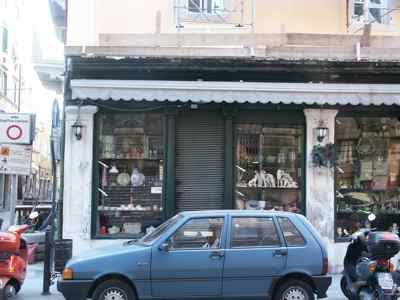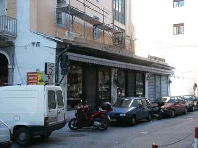 Basamento della facciata principale in pietra bianca bulinata. Paraste rifinite ad intonaco scandiscono il ritmo di facciata. Serramenti vetrati in legno a specchiatura unica di grandi dimensioni, ritmati da colonnine in ghisa verniciate con capitello in stile corinzio. Serrande metalliche e cassonetto superiore in legno. Fanali metallici di recente fattura ancorati alle paraste sulla facciata principale. Facciate laterali rifinite ad intonaco.