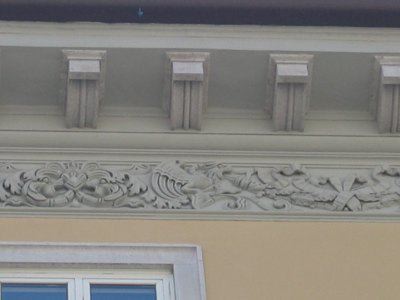 PANDURO (esterno) Il panduro collocato in chiave d'arco della Portizza raffigura un Ercole incappucciato da una testa di leone, con le zampe incrociate sotto al mento BASSORILIEVI (esterno) Un fregio a bassorilievo con motivi vegetali e allegorici corona la parte superiore del tetto. Le Lunette delle finestre del primo piano sono decorate con dei motivi allegorici a bassorilievo.