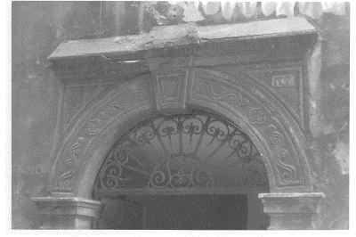 ELEMENTI ORNAMENTALI (esterno) Il portale ad arco presenta decorazioni a rilevo con motivi vegetali e floreali. In chiave d'arco è scolpita una rosellina. Sui pilastri che sostengono l'arco sono raffigurati motivi a scudo araldico e fiori.