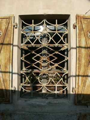 ELEMENTO ORNAMENTALE (esterno) Inferriate in ferro battuto decorate da motivi geometrici in corrispondenza dei fori architettonici del piano terra. AFFRESCO (interno) Nell'atrio d'ingresso, raffigurazione parietale di S. Giusto protettore e patrono della città (PICT0191.JPG), raffigurata nelle sue mani, con chiara identificazione della cattedrale sul colle, delle mura medievali, della città esistente al loro interno e, forse nell'angolo sinistro vicino alla stessa cattedrale l'edificio stesso in cui si trova l'affresco.