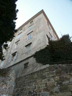 Corpo edilizio posto alle pendici del colle di S. Giusto, integrato nel borgo della città vecchia. Si sviluppa su quattro piani fuori terra, attico sopraelevato e livello interrato ad uso cantina. Strutture portanti verticali in muratura a sacco di pietra arenaria sbozzata a corsi suborizzontali, in mattoni pieni di laterizio in corrispondenza della sopraelevazione dell'attico. Orizzontamenti con strutture ad orditura singola e tavolato ligneo. Scala con elementi in pietra appoggiati su muratura portante laterale e setto centrale. Vani di servizio con affaccio diretto al vano scala in corrispondenza dei pianerottoli di interpiano. Copertura con puntoni appoggiati alla trave di colmo; orditura secondaria costituita da arcarecci e tavelle in cotto; manto di copertura in coppi curvi rossi. Facciate trattate in modo uniforme, basamento in pietra lungo l'intero corpo di fabbrica.