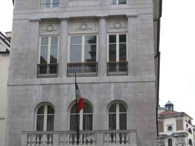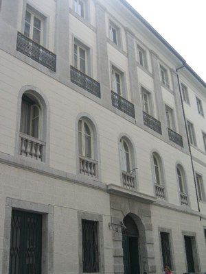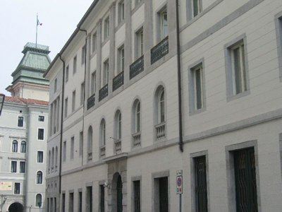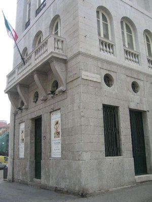 TARGA (esterno) lastra lapidea posta sul fronte interno verso il piazzale, recante incisa la scritta commemorativa "PIETRO NOBILE/ CAMPESTRO IN CANTON TICINO 10.10.1776 - VIENNA 7.11.1854/ DELL'ARCHITETTURA NEOCLASSICA TRIESTINA ARTEFICE/ CONSIGLIERE AULICO DELLE FABBRICHE/ DIRETTORE DELLA SCUOLA DI ARCHITETTURA A VIENNA/ NEL 150° ANNO DELLA MORTE/ LA SOCIETA' DI MINERVA IL COMUNE DI TRIESTE/ 7 NOVEMBRE 2004".