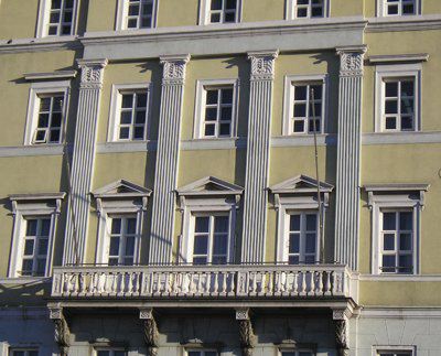 BALAUSTRA (esterno): Balcone con parapetto a balaustre ad anfora in corrispondenza delle parti aggettanti del primo piano. PARASTE (esterno): Paraste scanalate di ordine tuscanico tra primo e secondo piano in corrispondenza delle parti aggettanti. RILIEVI (esterno): Tondi decorativi raffiguranti le parti del mondo, opera di Pietro Zandomeneghi. Rettangoli scolpiti a bassorilievo da Giuseppe Moscotto e Giovanni Depaul rappresentano l'Onore, l'Industria, la Navigazione, la Riflessione, la Religione, la Costanza, la Beneficenza e il Commercio. I rilievi sono collocati negli spazi tra i fori architettonici del pianoterra.