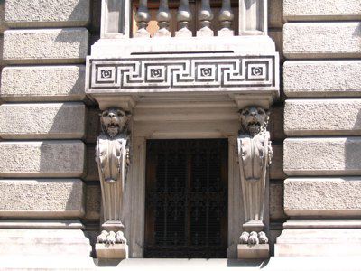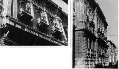 ISCRIZIONE (esterno) Sul parapetto del balcone del secondo piano della facciata principale è collocata l'iscrizione "CASSA DI RISPARMIO TRIESTINA" STEMMA (esterno) Sopra il portale d'ingresso stemma ovale con ape a rilievo e il motto "Lavora Raccogli Aumenta". ELEMENTI ORNAMENTALI (esterno) Riquadri decorativi con motivi geometrici e a nastri in corrispondenza delle specchiature tra i fori dell'ultimo piano. Motivi decorativi a greca alla base dei balconcini del primo piano. MENSOLE (esterno) Mensole a voluta in pietra bianca con testa d'uomo al quarto piano, con zampe e testa leonina al primo piano. Mensole a voluta in pietra bianca con motivo vegetale a sostegno dello sporto di linda e dei balconcini dei piani superiori. PANDURI (esterno) Mascheroni raffiguranti volto umano in chiave di volta in corrispondenza di alcune aperture del primo piano. LESENE (esterno) Lesene scanalate, rifinite a intonaco, con capitello corinzio a livello del secondo e terzo piano. SEMICOLONNE (esterno) Semicolonne scanalate, rifinite a intonaco, con capitello corinzio a livello del secondo e terzo piano del riquadro centrale della facciata principale. BALAUSTRE (esterno) Tutti i balconi sono ornati da balaustre in pietra con balaustrini ad anfora e pilastri angolari.