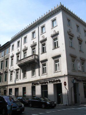 L'edificio, costruito all'incrocio tra le vie Mazzini e Cassa di Risparmio, fu realizzato nel 1850 su disegno degli architetti Giuseppe e Domenico Righetti. L'immobile è costituito da quattro piani fuori terra. La facciata prospiciente la via della Cassa di Risparmio è ingentilita da un balcone con poggiolo in pietra. Il portale d'ingresso e le finestre del secondo piano presentano decorazioni sopra l'architrave. Per molti anni questo palazzo fu la sede della Banca Triestina. Attualmente ospita un altro istituto bancario.