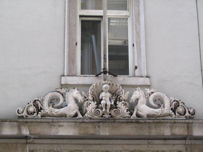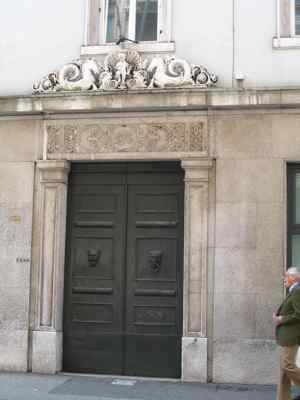 ELEMENTI ORNAMENTALI (esterno) Decorazioni a motivi floreali e spiraliformi e tondi con profili di uomini illustri del passato a bassorilievo ornano le finestre del secondo piano. SCULTURE (esterno) Sopra la trabeazione del portale in via Mazzini è presente un gruppo scultoreo raffigurante Mercurio entro una conchiglia affiancato da due tritoni. LAPIDE (esterno) Sulla facciata in via Mazzini è collocata una lapide in pietra bianca con il leone di San Marco scolpito a bassorilievo