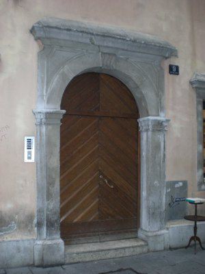 L'edificio sorge all'interno della zona più antica di Trieste, Cittavecchia, modificata negli anni Trenta del Novecento da pesanti interventi avviati con il progetto di sistemazione del colle di San Giusto. Tra gli immobili risparmiati dalle demolizioni rientra l'edificio con affaccio su Via del Ponte, occupato al piano terra da locali commerciali e ai piani superiori da abitazioni. In linea con l'antica tipologia architettonica del borgo, la struttura presenta fori finestra e bassi portali ad arco arricchiti da cornici lineari in pietra bianca d'Aurisina e capitelli. L'immobile, costruito all'angolo tra via del Ponte e Piazza Vecchia, presenta pianta rettangolare e due affacci. L'edificio si sviluppa per un'altezza di cinque livelli fuori terra. La facciata prospiciente via del Ponte è caratterizzata, al pianoterra, da un portale rinascimentale in pietra ad arco con elemento a voluta in chiave di volta e due portali rettangolari. Il lato su piazza Vecchia presenta due aperture d'ingresso rettangolari. Tutte le aperture dello stabile, ad eccezione di quelle dell'ultimo piano, sono coronate da architrave lineare. Alla fine dell'Ottocento l'immobile risulta di proprietà del commendatore Carlo de Porenta, che ne detiene il possesso fino al 1935 quando viene acquistato dal Comune di Trieste. Nel provvedimento di vincolo del 1935 si evidenzia il pregio del rostro in ferro battuto del portale d'ingresso, oggetto primario di tutela ed ora non più in loco. Solamente con la riconferma del vincolo, nel 1958, la tutela è stata estesa all'intero fabbricato. Con il "Piano di Recupero", L 457 del 1978, esteso all'intero isolato tra il 1984 ed il 1985, l'immobile è oggetto di importanti modifiche, a firma dell'architetto Franco Stagni, concernenti, in particolare, il restauro degli elementi architettonici esterni.