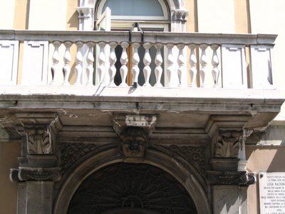 ELEMENTI ORNAMENTALI (esterno) All'ultimo piano, tra le finestre, sono presenti dei riquadri decorativi con un motivo floreale nel tondo centrale. PANDURO (esterno) Un panduro raffigurante una testa d'uomo è collocato in chiave di volta del portale d'ingresso principale. BALCONE (esterno) Il balcone presenta un parapetto con balaustrini in pietra bianca. LESENE (esterno) Lesene trattate ad intonaco e prive di capitello decorano la facciata all'altezza del secondo e terzo livello.