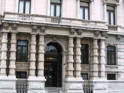 ISCRIZIONE Il timpano sul tetto reca l'iscrizione ASSICURAZIONI GENERALI 1831. COLONNE Colonne binate a sostegno del poggiolo, colonnine scanalate di ordine ionico ai lati delle finestre del primo piano. PARASTE Paraste scanalate con capitello corinzio ai lati delle finestre del secondo piano. BALAUSTRE Le aperture del primo piano presentano finte balaustre in pietra. Il poggiolo è protetto da una balaustra in pietra. OBELISCHI Due obelischi in pietra sono collocati ai lati del timpano.