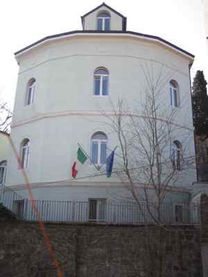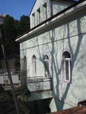 ANELLI MODANATI (esterno): Anelli modanati in pietra bianca posti in facciata sotto la linda (IMG_0985). SCULTURA RAFFIGURANTE MADONNA CON BAMBINO (esterno): Scultura in pietra raffigurante la Madonna con bambino. Inserita in una nicchia ricavata nel muro che sovrasta la scaletta che conduce al giardino retrostante (IMG_0977).