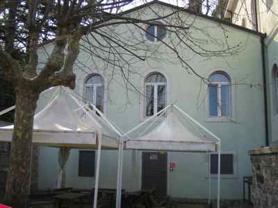 La scuola materna "Tor Cucherna" sorge sul colle di San Giusto, poco distante dall'omonimo castello. Si trova su un lotto frammentato da terrazzamenti che livellano le pendenze del terreno. L'edificio è composto da un fabbricato principale che ospita aule, servizi e cucine disposto su tre livelli e sottotetto. Vi è un secondo fabbricato su due livelli che ospita il locale impianti e la mensa. Le strutture verticali sono in muratura portante di pietra arenaria. Gli orizzontamenti sono in legno, con volte in pietra che reggono i pianerottoli della scala. La copertura è realizzata in calcestruzzo con manto in coppi curvi rossi. Le facciate presentano alla base la finitura a finto bugnato liscio; marcapiani in intonaco definiscono la restante superficie intonacata.
