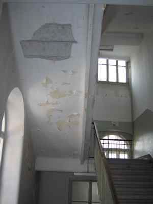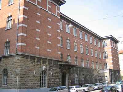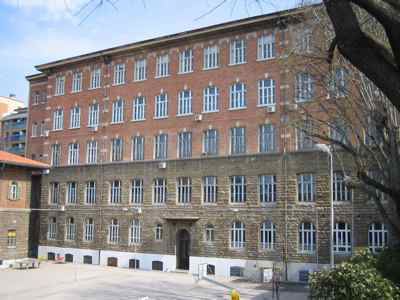FABBRICATO PRINCIPALE Basamento in pietra bianca bulinata. Fascia superiore in bugnato a conci di pietra arenaria. Un marcapiano modanato in pietra bianca, che sovrasta un fregio continuo dentellato, segna la divisione dal resto della facciata. Essa è interamente rivestita in mattoni faccia a vista con alcuni elementi in pietra bianca a marcare le paraste. Elementi in pietra bianca inseriti anche tra gli archi ribassati dei fori dell'ultimo piano. Facciata su Via Ressel cieca. Parapetti delle due terrazze su Via Combi in pietra bianca. Banchina in pietra retta da coppie di reggimensole lavorate a volute, emergenti da un doppio fregio continuo dentellato. Bocche di lupo con inferriate nel basamento. Primi due livelli con fori arcuati a tutto sesto con serramenti in legno verniciato color bianco a nove o undici specchiature. Al primo livello due fori di dimensioni più ridotte a lato del portone sul cortile e nei volumi laterali: serramenti sempre lignei verniciati color bianco a cinque o tre specchiature. Al secondo livello di Via Combi doppi serramenti nel corpo centrale. Nel corpo laterale destro due bifore con serramenti in legno a tre specchiature. I restanti tre livelli hanno fori ad arco ribassato con davanzale e chiave di volte in pietra bianca; doppi serramenti in legno verniciato color bianco a undici specchiature. Nei corpi laterali che si affacciano sul cortile trifore e quadriforme con serramenti in legno a tre specchiature. Nel corpo laterale sinistro fori arcuati a tutto sesto o ad arco ribassato con serramenti lignei a tre specchiature. Portoni d'ingresso lignei a due battenti ciascuno e sopraluce. I fori arcuati sono tutti con cornice in pietra bianca modanata e pensilina sovrastante in legno che poggia su due reggimensole a volute in pietra bianca (IMG_1019). Gronda e pluviali esterni in lamiera. Doppio accesso su Via Combi. Corridoi pavimentati alla veneziana; aule con pavimenti in listelli di legno oppure con linoleum e controsoffitti in doghe d'alluminio. Corridoi occasionalmente inframmezzati da pareti lignee (IMG_1049). Scale nei corpi laterali. Sono di tipo appoggiato con trave d'acciaio di sostegno. Gradini in pietra bianca bulinata. Parapetto in ferro verniciato color bianco con passamano in legno (IMG_1046). RICREATORIO Basamento in pietra bianca bulinata. Fascia superiore in bugnato a conci di pietra arenaria. Rimanente parte di facciata rivestita in mattoni faccia a vista con conci di pietra arenaria a marcare gli spigoli del fabbricato. Scala laterale di accesso diretto al primo livello in pietra bianca bulinata con parapetto interamente in ferro. Facciata su Via Ressel cieca con solo sei piccoli fori rettangolari di recente fattura con serramenti in alluminio a unica specchiatura. Primo livello con fori arcuati a tutto sesto con serramenti in ferro verniciato color verde e sopraluce; inoltre fori rettangolari con serramenti in legno verniciato color verde a due specchiature con inferriate verniciate color verde. Una porta in ferro permette l'accesso al primo livello. Fori arcuati a tutto sesto nella struttura della scala con serramenti in legno a quattro specchiature o tamponati da assi di legno. Nel raccordo di collegamento con l'edificio principale fori rettangolari tamponati da tavolati dipinti. Secondo livello con fori arcuati a tutto sesto con davanzale in pietra bianca. Doppi serramenti in legno color bianco a quattro specchiature e sopraluce, la maggior parte dei quali provvista di oscuranti in legno verniciati color verde. Scala interna rivestita di linoleum antiscivolo con parapetto in ferro color verde. Corridoi, stanze e aule gioco pavimentate con quadrettoni di linoleum; controsoffitti costituiti da pannelli di fibre minerali. Palestra del livello inferiore con superficie in parquet.