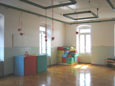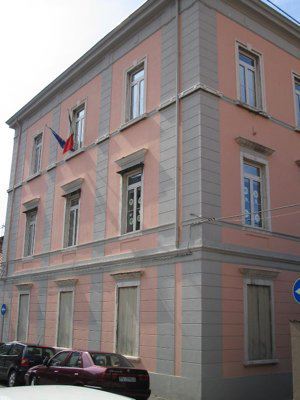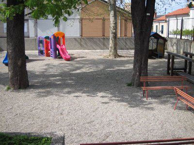 Fascia basamentale trattata a intonaco tinteggiato di grigio. La restante parte delle facciate è intonacata e tinteggiata color rosa; al primo livello è presente un intonaco bugnato liscio a corsi orizzontali. Lesene intonacate in leggero aggetto, tinteggiate in colore grigio e finite con stilature orizzontali. Un marcapiano modanato intonacato separa il primo dal secondo livello; due cornici sono poste all'altezza dei davanzali dei fori del secondo e terzo livello. Al di sotto della banchina, in pietra arenaria intonacata, è presente una fascia di coronamento in intonaco decorata da semplici motivi geometrici. Fori architettonici con cornice in pietra bianca bulinata e gocciolatoio ai primi due livelli; cornice modanata in pietra bianca bulinata al terzo livello. Al primo livello fori protetti da grate in ferro o resi ciechi con tavole di legno. Ulteriori gocciolatoi in lamiera al secondo livello. Foro del portone d'ingresso con cornice in pietra bianca bulinata, architrave e gocciolatoio modanato sostenuto da due reggimensole. Tutti i serramenti sono in PVC color bianco a due specchiature e sopraluce; fanno eccezione i fori del vano scale in vetrocemento. Portone d'ingresso ligneo a due battenti con sopraluce protetto da inferriata. La struttura della doppia rampa è in pietra arenaria a vista con gradini in pietra bianca bulinata e parapetto in ferro. Gronda e pluviali esterni in lamiera verniciata color bianco. Muro perimetrale in pietra arenaria e cemento con portone e parapetti in ferro verniciato color rosso. Giardino pavimentato con ghiaia (IMG_1176). Atrio d'ingresso e corridoi con pavimento alla veneziana. Aule gioco e uffici pavimentate con listelli di legno; mensa con linoleum; locali del sottoscala e cucine con piastrelle; sottotetto con tavoloni di legno e mattonelle. Scala appoggiata con gradini in pietra bianca bulinata (IMG_1170) rivestiti in alcune rampe con materiale plastico antiscivolo. Putrella in ferro di supporto. Parapetto in ferro verniciato di color verde e passamano in legno.
