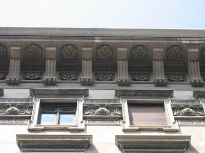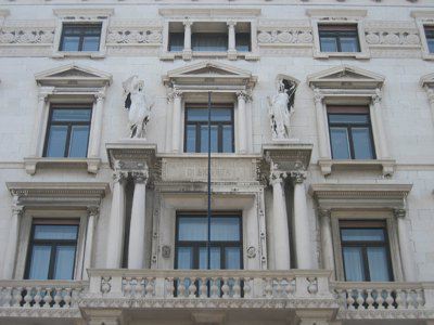ELEMENTI ORNAMENTALI (esterno): Elementi decorativi a motivi floreali in pietra a rilievo in corrispondenza delle specchiature tra i fori architettonici all'ultimo piano e dello sporto di linda. ELEMENTI ORNAMENTALI (esterno): Chiave di volta a decorazione degli archi a tutto sesto, raffigurante volto di uomo scolpito in pietra. MENSOLE (esterno): Mensole a voluta in pietra a sostegno dei balconi e dello sporto di linda. BALAUSTRE (esterno): Parapetto dei balconi in pietra con balaustrini ad anfora. STATUE (esterno): Statue poste in corrispondenza dell'ammezzato nelle lunette della facciata principale raffiguranti le personificazioni di Fuoco e Aria, Pensiero e Azione, Acqua e Terra, eseguite dallo scultore Giovanni Mayer. STATUE (esterno): Statue poste in corrispondenza del secondo piano della facciata principale raffiguranti le personificazioni della Previdenza e della Protezione, eseguite dallo scultore Gianni Marin.