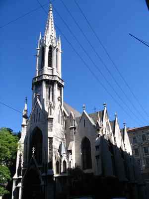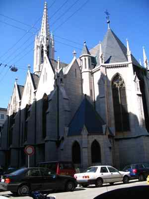 La chiesa, al centro di una piazza chiusa da alti palazzi, si presenta nelle forme agili e frastagliate del gotico tedesco. Esternamente è caratterizzata da contrafforti scalari, archi acuti, guglie e pinnacoli. L'abside è poligonale. Al centro della facciata principale, sopra al portale gotico, s'innalza un alta torre campanaria. L'interno, diviso in tre navate da quattro colonne, riceve luce dalle alte finestre ogivali con intrecci a traforo che si aprono sulle tre campate delle navate, sulla facciata e sull'abside.