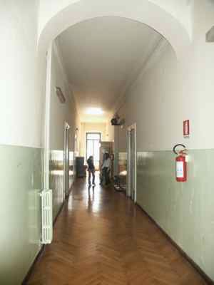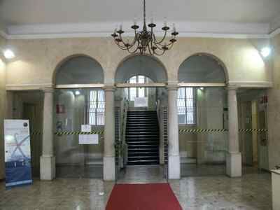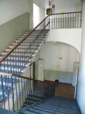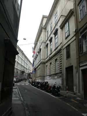 Lungo le vie pubbliche, abbassamento in pietra bianca bulinata posto a correre lungo l'intera facciata, basamento in finto bugnato ad intonaco in corrispondenza del piano terra, con paraste poste a suddividere la facciata principale in tre porzioni ed a rafforzare gli spigoli dell'edificio; porzione superiore di facciata trattata ad intonaco liscio. Serramenti vetrati in legno massello a doppia anta verniciati colore verde con sopraluce e fascia vetrata inferiore apribile a vasistas. Al piano terra fori architettonici rettangolari, con piattabanda in finti conci trattati ad intonaco e davanzale in pietra bianca posto a correre lungo l'intera facciata; oscuranti esterni in doghe di legno massello verniciate colore verde; portale di accesso centrale in legno massello verniciato colore marrone, con anta centrale vetrata con inferriata in ferro battuto, specchiature laterali e superiori in legno massello; ai lati del portale, due fori finestra protetti da inferriate in ferro battuto danno luce all'ampio atrio; un portone in legno massello con sopraluce vetrato protetto da inferriata in ferro battuto dà accesso alla basilica paleocristiana. Al primo piano fori architettonici rettangolari incorniciati da edicole modanate in pietra bianca, timpani triangolari in corrispondenza della porzione centrale della facciata principale, architravi orizzontali modanati in corrispondenza degli altri fori. Fascia marcapiano a livello del davanzale delle finestre del secondo piano, incorniciate da elementi modanati in pietra bianca, con mensole a voluta a sostegno del davanzale. Coronamento a livello della linea di gronda, con fregio decorato da motivi geometrici e modanatura a dentelli posta a correre lungo il filo della banchina. Finestre dell'attico incorniciate da elementi modanati con concio di chiave in pietra bianca. Gronda e pluviale in lamiera, interni alla muratura a livello del piano terra in corrispondenza delle facciate lungo la pubblica via, banchina trattata ad intonaco e manto di copertura in coppi curvi rossi uso Trieste. Facciata rivolta verso il cortile interno trattata semplicemente ad intonaco, con fori finestra incorniciati da elementi semplici in pietra e protetti da inferriate in ferro battuto in corrispondenza del livello rialzato del cortile. Atrio di ingresso monumentale pavimentato in marmo, colonnato di separazione dal vano scala con colonne doriche in pietra di Aurisina bulinata, superfici verticali in spatolato colore beige. Scala del tipo appoggiato su putrelle metalliche con gradini in pietra bianca bulinata, pianerottoli sostenuti a mezzo di volte ribassate in pietra, balaustra in ferro battuto con corrimano ligneo; corridoi al primo ed al terzo piano pavimentati in battuto di cemento e graniglia; al secondo piano in parquet disposto a spina di pesce. Abbassamento laterale in pittura ad olio. Pavimenti delle aule in parquet ligneo disposto a spina di pesce. Serramenti interni in legno massello verniciato bianco, vetrati con specchiature di grandi dimensioni in corrispondenza delle porte di comunicazione tra i corridoi. Abbaini vetrati danno luce al sottotetto sul lato cortile.