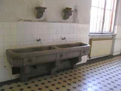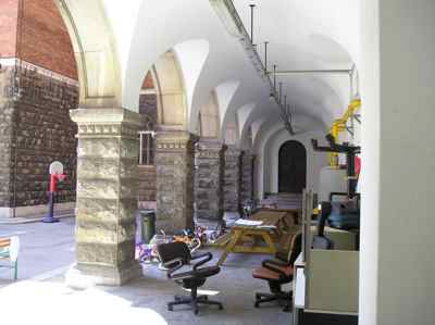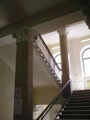 LESENE (Esterno): Lesene realizzate in mattoni di laterizio e blocchi squadrati lisci di pietra bianca; la parte sommatale, è integrata da due doppie mensole in pietra bianca, decorate a foglia d'acanto, poste sotto la cornice del tetto. MENSOLE (Esterno): Mensole in pietra bianca decorata a foglia d'acanto e volute. STEMMA (Esterno): Stemmi rettangolari in pietra bianca, raffiguranti un'alabarda, inseriti nel bugnato della facciata di Via Commerciale e di Via Manna. MARCAPIANO (Esterno): Cornice marcapiano, posta tra il terzo e quarto piano, in pietra bianca con gocciolatoio a dentelli, modanata da fasce lisce e listelli. CORNICE (Esterno): Cornice neoclassica composta da lastre in pietra bianca e decorata con modanature a fascia e ad ovuli. FONTANA (Interno- cortile): Fontana in pietra bianca collocata in cortile e interclusa nel bugnato del piano terra: la struttura è composta da un arco a tutto sesto, in conci squadrati e bugnati con concio di chiave raffigurante un panduro, rivestito sull'estradosso da una cornice in pietra bianca modanata e, sullo sfondo, da una specchiatura semicircolare. Il fronte della vasca è di forma semicircolare convessa, sporgente dal filo del muro, e decorato da pannelli in pietra. STEMMI (Interno- cortile): Cinque stemmi in pietra bianca, inseriti nella superficie bugnata del prospetto della palestra, collocati tra le doppie finestre e costituiti da pannelli lapidei raffiguranti simboli ludici. STEMMI (Interno- cortile): Quattro stemmi in pietra posti sotto la prima cornice marcapiano del portico e in asse con l'imposta degli archi: sono costituiti da un unico pannello con cornice nel quale sono raffiguranti strumenti utilizzati per lo studio della musica, della geografia, del disegno e degli scritti. FONTANE (Interno): Fontane in marmo di Aurisina, disposte lungo la parete del corridoio e costituite da una pannello in pietra, fissato al muro, e da una vasca monolitica sorretta da piedritti modanati di stessa natura. MENSOLE (Interno): Mensole in pietra modanate con volute e foglie d'acanto, inserite nel muro del corridoio del primo piano ed utilizzate ad uso ornamentale. BUSTO (Interno): Busto in bronzo raffigurante Guido Corsi, collocato nell'atrio dell'ingresso principale, con lapide commemorativa in marmo. STATUA (Interno): Statua in pietra bianca con basamento in marmo, sistemata nella navata laterale dell'atrio d'ingresso e raffigurante una figura in stile classico.