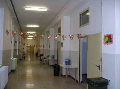 Il paramento murario esterno del piano terra, rivestito con lastre di pietra bocciardate, è delimitato, superiormente, da una cornice in pietra. Le facciate dei piani superiori sono rivestite da mattoni a faccia vista e da cornici in pietra artificiale, poste all'altezza del davanzale e dell'architrave dei fori. La cornice del tetto è realizzata con conci di pietra artificiale a forma di mensola posti su una fascia non modanata in pietra artificiale. Il rivestimento dei pilastri a sezione quadrata e dell'architrave del portico è costituito da lastre di pietra artificiale bocciardate, similari al rivestimento del paramento murario del piano terra. I fori del piano terra, di forma rettangolare, sono protetti da una grata in ferro saldato e provvisti di infisso in alluminio a due ante con quattro specchiature in vetro e sopraluce a vasistas. I fori dei piani superiori e le porte-finestre del terrazzo sono dotati di cornice modanata in pietra artificiale; l'infisso è in alluminio verniciato di colore bianco, a due ante con quattro specchiature in vetro e sopraluce a vasistas. Il terrazzo, ricavato sulla copertura piana del portico, è pavimentato con mattonelle in pietra ed è delimitato da una ringhiera in ferro. La scala d'ingresso è fiancheggiata da spallette in muratura, rivestite con lastre in pietra artificiale bocciardate. La struttura della scala è in muratura, rivestita con lastre in pietra a forma irregolare sulla superficie delle pedate; le alzate sono realizzate con blocchi squadrati di pietra massiccia naturale. I fori d'ingresso sono costituiti da tre alti portoni, di forma rettangolare, intervallati da setti murari rivestiti da lastre di pietra artificiale. I serramenti dei portoni d'ingresso sono in ferro, a sei specchiature vetrate protette con una grata in ferro saldato; l'atrio di ingresso è caratterizzato da una parete vetrata con telaio in legno dotato di sopraluce. La superficie delle pareti dell'atrio d'ingresso e del vano scala è rivestita con lastre di pietra artificiale levigata. La pavimentazione dei corridoi è in mattonelle di graniglia policroma; nei locali di servizio e nei pianerottoli del vano scala è in piastrelle di ceramica. La pavimentazione delle aule e degli uffici è in parquet. Le porte delle stanze sono in legno verniciato, ad un'unica anta. Le porte di collegamento con i corridoi e il vano scala sono in ferro con maniglia antipanico. La scala è in muratura con scalini rivestiti da lastre di marmo. La ringhiera è in ferro saldato verniciato con corrimano in legno e poggia su una spalletta in muratura.