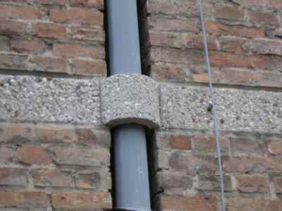 CORNICE: cornice del tetto composta da una serie di grossi dentelli a forma di cuneo in pietra massiccia, cinti superiormente da una sopracornice in lastre di pietra lisca. MARCAPIANO: in pietra artificiale posta a filo della muratura con blocchi sagomati per l'inserimento del pluviale.