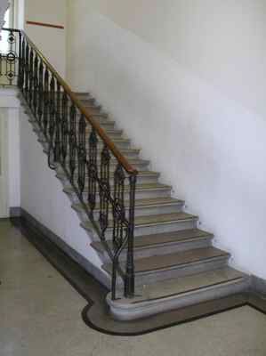 CORNICE MARCAPIANO (esterno): in malta cementizia, tinteggiata di colore bianco. STEMMA (esterno): in pietra bianca, posti in corrispondenza degli angoli della facciata principale e raffiguranti una specchiatura decorata con un'alabarda. PENSILINA (esterno): in pietra artificiale, decorata nell'intradosso da specchiature e sorretta da due mensole sagomate in pietra artificiale. La cornice della pensilina è sagomata con motivi neoclassici con gocciolatoio e palmette in pietra sugli spigoli.