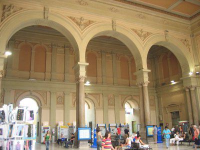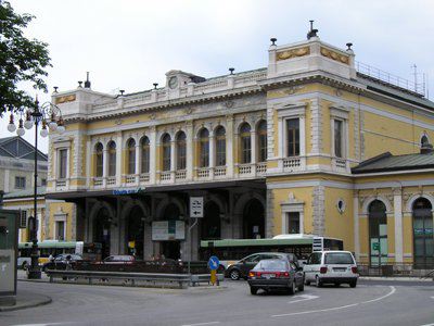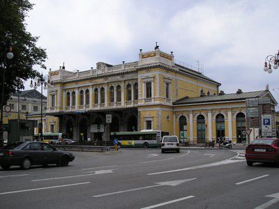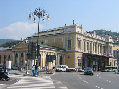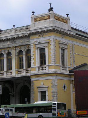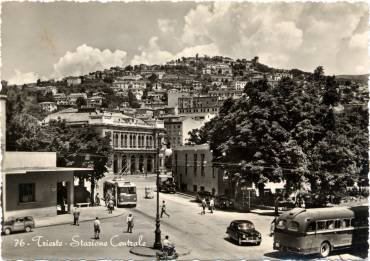 Nel 1850 vennero avviati i lavori di costruzione della prima stazione ferroviaria di Trieste; la prima linea aperta in città permetteva il collegamento con Vienna, al quale si aggiunse nel 1857 la linea Trieste Lubiana. Per la costruzione della prima stazione, che si trovava un centinaio di metri arretrata rispetto alla struttura attuale, fu scavata parte della collina di Scorcola e vennero demoliti diversi edifici. Poco tempo dopo si rivelò la necessità di ingrandire la stazione e di costruire un nuovo edificio per accogliere i passeggeri. Nel 1869 il Lazzaretto S. Teresa fu demolito e nel 1873 si iniziarono i lavori per l'ampliamento della stazione. La nuova stazione, costruita su progetto dell'architetto Wilhelm Flattich di Stoccarda, fu inaugurata il 19 giugno 1878 e completata nel 1888. Il complesso della stazione era costituito anche da altri due edifici; la cosiddetta "Casa del ferroviere" e la rimessa semicircolare, demoliti negli anni Settanta. Diverse modifiche interessarono la struttura nel corso del XX secolo, tra la creazione di nuovi locali per ospitare servizi e uffici. Attualmente parte dell'edificio è in restauro.