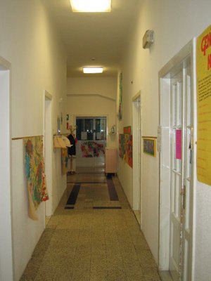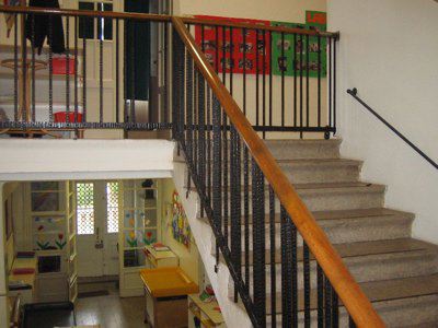 Il corpo di fabbrica di destra ha una fascia basamentale in conci di pietra arenaria. La facciata è intonacata e tinteggiata color rosa salmone. Una cornice in pietra bianca è posta all'altezza delle architravi dei fori architettonici del secondo livello. La porzione di facciata sotto la linda è intonacata e tinteggiata color grigio. Il corpo di fabbrica di sinistra ha un basamento in intonaco trattato a rustico; la facciata è interamente intonacata e tinteggiata color rosa salmone e grigio nella porzione sotto la linda. Il foro d'ingresso principale è incorniciato da elementi in pietra bianca; il portone è a due battenti in legno con doppia specchiatura; è sormontato da una tettoia in travi di legno con manto di copertura in coppi rossi sostenuta da un reggimensola e da una colonna in pietra bianca. I fori del primo livello che danno sul fronte strada e sul parcheggio interno sono a tutto sesto ad eccezione della porta di servizio sul fabbricato di sinistra. I fori sul retro sono di forma rettangolare. Fori rettangolari al secondo livello; solo le finestre del volume di destra hanno il gocciolatoio in pietra bianca. Tutti i serramenti sono in PVC color bianco; sul fronte principale a quattro o sei svecchiature; sul retro a due o tre specchiature protette da grate in ferro. Fa eccezione l'uscita di sicurezza posta sul retro che è in alluminio verniciato nero. Il fabbricato di destra ha, al secondo livello, un ampio terrazzo piastrellato cinto da un parapetto in pietra bianca con tamponature in elementi di laterizio. Gronda e pluviali in lamiera verniciata color marrone e rosa salmone. Su fronte strada il fabbricato è cinto da un muro in pietra arenaria parzialmente intonacato e da un parapetto con elementi in pietra bianca. L'accesso al portone principale dell'edificio avviene tramite una rampa di gradini in pietra bianca. Sul lato destro un cancello in ferro chiude il parcheggio asfaltato e il piccolo parco giochi pavimentato con ghiaia. All'interno tutti gli ambienti del primo livello sono pavimentati con piastrelle di ceramica; al secondo livello corridoi e servizi pavimentati con piastrelle, aule con listelli di legno o linoleum. Alcune stanze sono controsoffittate in pannelli di fibre minerali. La scala ha gradini in pietra bianca bulinata, parapetto in ferro battuto e corrimano in legno. Serramenti interni e partizioni in legno verniciato color bianco.
