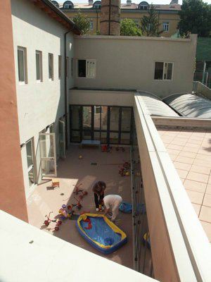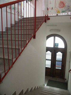 Immobile su due livelli continui fuori terra. La recente realizzazione del nuovo ingresso sulla Via Alessandro Manzoni, con struttura metallica in acciaio verniciato color antracite, travature in legno lamellare ed ampie specchiature vetrate, costituisce l'atrio di accesso all'asilo comunale ed il collegamento con l'attiguo edificio. La pianta dell'edificio è suddivisa in un corpo centrale a due livelli con copertura falde e due corpi laterali ad un solo livello con copertura piana calpestabile. Sul retro del corpo principale sono stati recentemente edificati nuovi corpi edilizi ad un livello. Il prospetto principale è simmetrico e presenta elementi decorativi in stile neorinascimentale; il corpo centrale, in leggero aggetto, presenta due portali laterali. La facciata è suddivisa orizzontalmente da una cornice marcapiano posta in continuità con la copertina superiore del parapetto delle terrazze delle ali laterali. Le strutture verticali sono in muratura portante di arenaria a corsi irregolari suborizzontali, con cordoli perimetrali in calcestruzzo armato. Strutture orizzontali in laterocemento e copertura a falde con struttura in legno lamellare composta da capriate a sostegno della trave di colmo, puntoni ortogonali alla trave di colmo e tavolato ligneo. I vani scala sono appoggiati sulla muratura portante.