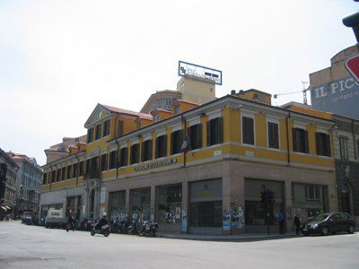 La struttura presenta pianta rettangolare e due piani fuori terra. Affaccio principale su Piazza Carlo Goldoni e secondario su Via Silvio Pellico. La facciata principale presenta fori commerciali al pianterreno, caratterizzato da rivestimento in pietra grigia; al centro si apre un portale ad arco a tutto sesto, con mensola in chiave di volta, affiancato da semicolonne lisce e semipilastri a fasce con capitello corinzio, a sostegno del balcone con parapetto in ferro battuto del secondo piano. Il piano superiore, trattato ad intonaco giallo, è caratterizzato da una serie di diciannove fori finestra, con cimasa lineare in pietra bianca e cornice marcapiano a sostegno dei davanzali. In corrispondenza della parte centrale della facciata si trova una sopraelevazione, coronata da timpano, su cui si aprono tre fori finestra. Il prospetto su Via Silvio Pellico presenta pianterreno con rivestimento a bugnato rustico e cinque archi a tutto sesto, e piano superiore a bugnato liscio e cinque fori finestra con cornice. A coronamento della facciata si trova un fregio decorato da motivi vegetali e al centro la scritta "Il Piccolo".
