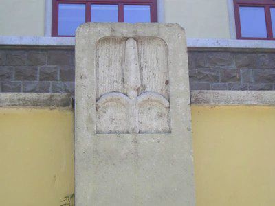 STELE (esterno): pilastro in pietra massiccia, inserito nel parapetto della scala e decorato con un'alabarda scolpita; sul retro è previsto l'alloggiamento dell'asta di una bandiera con due staffe in metallo (P1010030.JPG). OROLOGIO (esterno): orologio posizionato sul timpano in muratura del prospetto principale. MARCAPIANO (esterno): marcapiano in pietra artificiale, a profilo rettangolare, disposto sul limite superiore del rivestimento del piano interrato. CORNICE (esterno): cornice del tetto, a profilo rettangolare con gocciolatoio, in pietra artificiale.