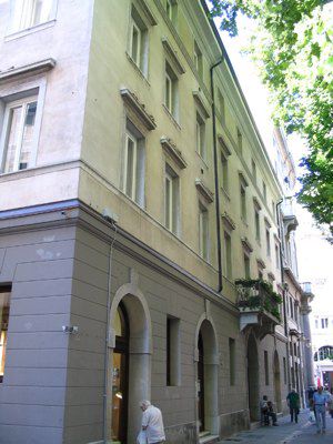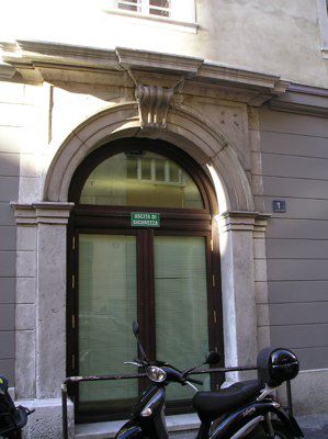BALCONI (esterno) Balconi all'altezza del primo piano ingentiliti da ringhiera in ferro battuto con un motivo di semplici linee curve. ELEMENTI ORNAMENTALI (esterno) Elemento decorativo a voluta in chiave di volta del portale d'ingresso principale, su via del Toro.