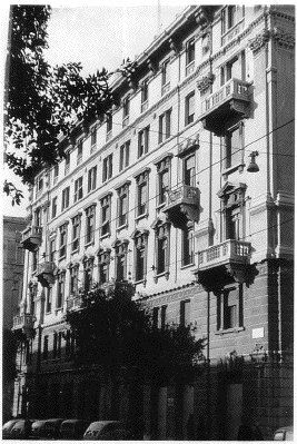 L'immobile sorge su Via Cesare Battisti, già Corsia Stadion, il cui nome deriva dal conte Stadion che nel 1846 diventa promotore dell'imbonimento del "torrente detto dello Scoglio, proveniente dal monte Staribrek a S. Giovanni, il quale andava a congiungersi all'altro detto di Cluz al ponte di Chiozza" (Generini, 1968, p. 322). Come testimoniano le fonti dell'epoca, dalla metà dell'Ottocento la via, in origine fiancheggiata da case di modeste dimensioni e di "poca apparenza", si caratterizza per la presenza di importanti palazzi, diventando "in breve una delle più belle vie della città" (Generini, 1968, p. 322-323). L'edificio in esame s'inserisce nella seconda fase dello sviluppo urbanistico della zona, databile agli inizi del Novecento. Il palazzo viene realizzato entro il 1903 su commissione delle Assicurazzioni Generali; il progetto, dello stesso anno, reca le firme dell'architetto Giorgio Polli e del dirigente dei lavori "I. Piani" (ACT_8472). L'edificio viene progettato secondo una "commistione tra elementi liberty, elementi biedermeier e revivaldegli stili storici che costituisce lo "stile" proprio della "casa-bene" per eccellenza, i palazzi della Ringstrasse" (Zanni, 1990, p. 99); i disegni presentano studi accurati dei particolari, soprattutto per gli interni, forniti direttamente alle singole maestranze specializzate. Nell'ala sinistra del pianoterra, in origine occupata dalla Latteria Trifolium, il 3 gennaio 1914 viene inaugurato da Marco Lovrinovich il Caffè San Marco; il locale, in stile floreale Liberty, è decorato da stucchi dorati, specchi, diversi dipinti raffiguranti figure di maschere, opera dell'artista Ugo Fiumani, e affreschi del pittore Guido Marusig. Lo storico Caffè viene ricordato come ritrovo degli irredentisti italiani e di letterati quali Italo Svevo e Umberto Saba; nel locale viene anche ambientato lo sceneggiato televisivo "Coscienza di Zeno", diretto da Sandro Bolchi. Il Caffè viene danneggiato nel maggio del 1915 dai dimostranti filo austriaci. Nel novembre del 1989 vengono completati dei lavori di ristrutturazione generale dell'edificio; nel 2000 il Caffè San Marco viene interessato da un restauro durato tre mesi e sostenuto dalle Assicurazioni Generali, proprietaria dell'immobile.