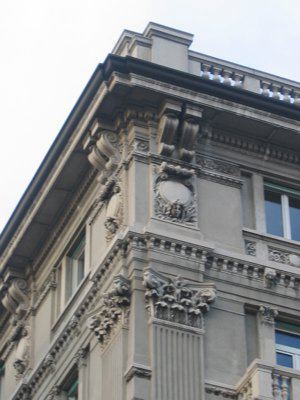 BALCONI (esterno): Balconi con balaustra in pietra in corrispondenza della sezione centrale del terzo piano, ai lati del quarto e quinto piano e a coronamento dei corpi aggettanti alle estremità della facciata principale. LESENE (esterno): Lesene di ordine gigante su alti piedistalli, scanalate nella parte superiore e arricchite da capitello corinzio in corrispondenza dei corpi aggettanti alle estremità di tutti e tre i prospetti. SEMIPILASTRI (esterno): Semipilastri con capitello corinzio in corrispondenza delle finestre tripartite poste alle estremità delle facciate e delle finestre bipartite del quinto piano. CORNICE (esterno): Cornice a dentelli lungo tutto il perimetro dell'edificio al di sopra del quinto e del sesto piano. ELEMENTI DECORATIVI (esterno): Rilievi in pietra raffiguranti motivi floreali, ghirlande, medaglioni e mensole a voluta a decorazione della superficie muraria dei tre prospetti dell'edificio. ELEMENTI DECORATIVI (interno): Decorazioni in stucco dorato, rilievi stile Liberty e affreschi caratterizzano le sale del Caffè San Marco al pianoterra dell'edificio.
