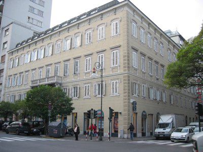 L'immobile sorge su Via Cesare Battisti, già Corsia Stadion, il cui nome deriva dal conte Stadion che nel 1846 diventa promotore dell'imbonimento del "torrente detto dello Scoglio, proveniente dal monte Staribrek a S. Giovanni, il quale andava a congiungersi all'altro detto di Cluz al ponte di Chiozza" (Generini, 1968, p. 322). Come testimoniano le fonti dell'epoca, dalla metà dell'Ottocento la via, in origine fiancheggiata da case di modeste dimensioni e di "poca apparenza", si caratterizza per la presenza di importanti palazzi, diventando "in breve una delle più belle vie della città" (Generini, 1968, p. 322-323). L'edificio in esame s'inserisce nella fase più importante di sviluppo urbanistico della zona, databile alla metà dell'Ottocento. L'edificio viene costruito nel 1828 su progetto di Giovanni Degasperi; nel 1852 l'architetto Luigi Buzzi interviene pesantemente sull'edificio con la sopraelevazione di un piano, determinando l'aspetto architettonico attuale. Nel corso del Novecento il palazzo, in particolare per quanto riguarda la parte del pianterreno destinata ad ospitare attività commerciali, è interessato da interventi di ristrutturazione e modifiche interne. Il vincolo è limitato alla facciata.