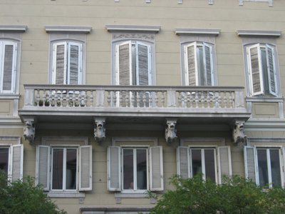 BALCONE (esterno): Balcone a balaustra in pietra sorretto da quattro mensole rappresentanti animali fantastici in corrispondenza della parte centrale del prospetto principale. POGGIOLO (esterno): Coppia di poggioli con parapetti n ferro battuto decorati da motivi floreali in corrispondenza edlle estremità del secondo piano del prospetto principale. FREGIO (esterno): Fregio a rilievo in pietra raffigurante motivi floreali a coronamento della superficie muraria del prospetto principale.